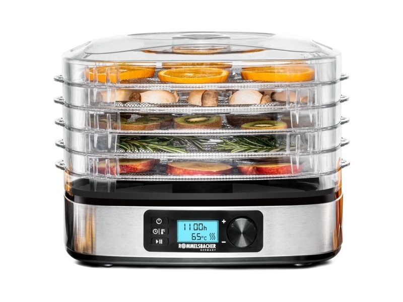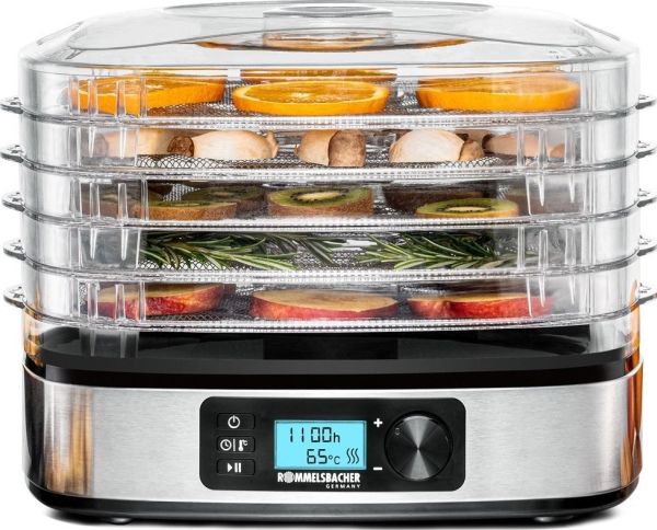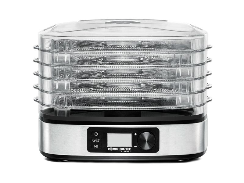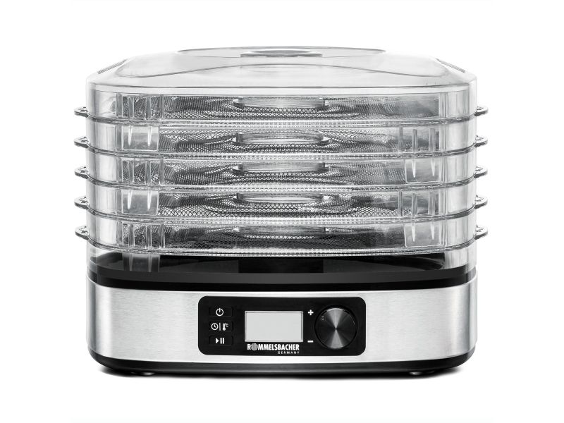 For a careful drying of fruit, vegetables, herbs, mushrooms and more: the compact dehydrator DA 350 is the perfect addition to the Rommelsbacher family of dehydrators. Drying - as the oldest form of food preservation - is experiencing a modern revival. This gentle way of preserving food without additives or preservatives has become an indispensable part of contemporary cuisine. Of course, this is best achieved with a high-quality electric dehydrator such as the DA 350, offering precise temperatures and also evenness. The drying racks are equipped with fine-meshed grids made of hygienic stainless steel and - as a clever feature - the racks are even height-adjustable. Thus, the volume is doubled in no time at all. The appliance is energy-saving and quiet and also easy to use. The temperature selection ranges from 35°C for raw food dehydration up to 75°C for quick power dehydration. Together with the 36-hour timer, this offers a maximum of possible uses. Two silicone molds for the production of 8 muesli bars complete this modern dehydrator. Delicious snacks and healthy sweets are just as easy to create as crunchy vegetable chips, teas, dried fruits for muesli and treats for animals. No matter which dietary preferences you have or which trendy delicacies you want to try - the DA 350 is the perfect companion.