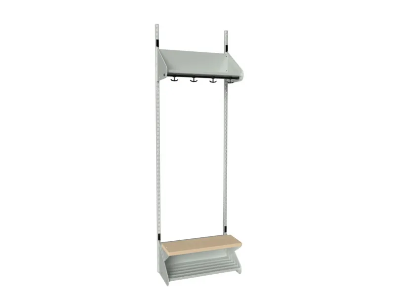 BST-Kombination H. Garderobenanfangsteil mit 2 Sitzplätzen und Bank. Hut- und Schuhablage ohne Trennwände aus pulverbeschichtetem grünem Metall, RAL 6021. 2 Wandschienen und Garderobenstange mit 6 Ankerhaken. Sitzbreite 300 mm und Gesamtbreite 615 mm. Bank mit Sitz aus Birken-Hochdrucklaminat.