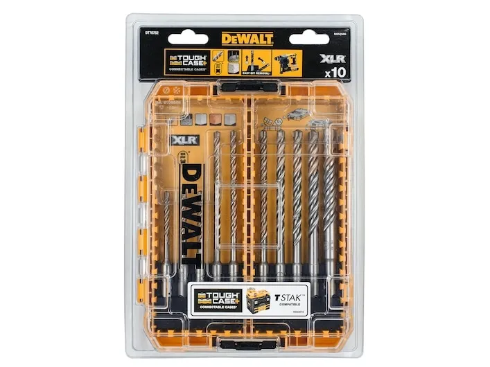 The 10-piece EXTREME Full Carbide SDS-plus hammer drill set DT70752 from DeWALT is suitable for continuous use in the hardest concrete, masonry, natural and artificial stone. The drill with solid carbide head achieves extremely high durability, drilling speed and service life. At the same time, the 160° drill head cutting edge design enables even better pinpoint drilling. The 4-stage helix enables effective dust removal and improves drilling performance (from 6mm O and 150mm working length). The core-reinforced drill structure increases stability and durability as well as break resistance (from 5mm O). The EXTREME Full Carbide SDS-plus hammer drill set DT70752 is suitable for use in SDS-plus hammer drills (battery and cable).