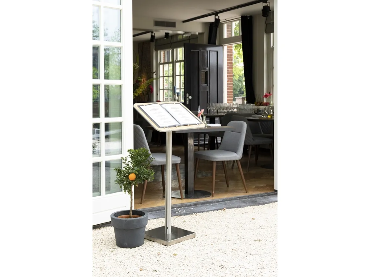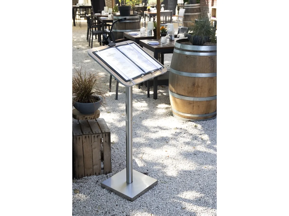 Securit® Classic Menu Stander er det perfekte valg til at vise din menu eller gæstebog udendørs eller i din indgang. Vis din menu, information eller brug det til gæstebog eller reservationsbog. Produceret af rustfrit stål med en lam