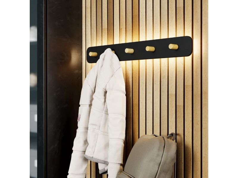 Die LED Wandleuchte CIVITATE besteht aus einem rechteckigen, schwarzen Metall-Körper mit abgerundeten Ecken. Dank der fünf Halterungen aus braunem Gummibaumholz bietet die Wandlampe genügend Platz für Jacken sowie Mäntel und kann so optimal als beleuchtete Garderobe genutzt werden. Die integrierten, umlaufenden LEDs am Körper spenden angenehmes warmweißes Licht und schaffen so eine indirekte Beleuchtung im Eingansbereich. Die minimalistische Leuchte rundet moderne Einrichtungsstile ab und und ist bequem über einen Schalter am Kabel ein- und ausschaltbar.