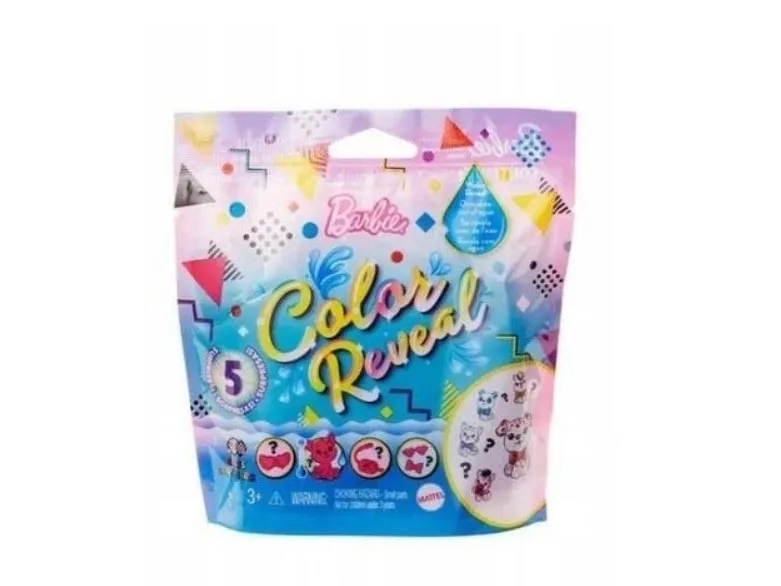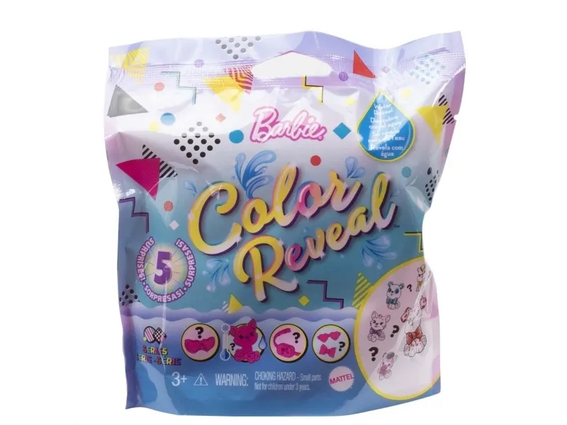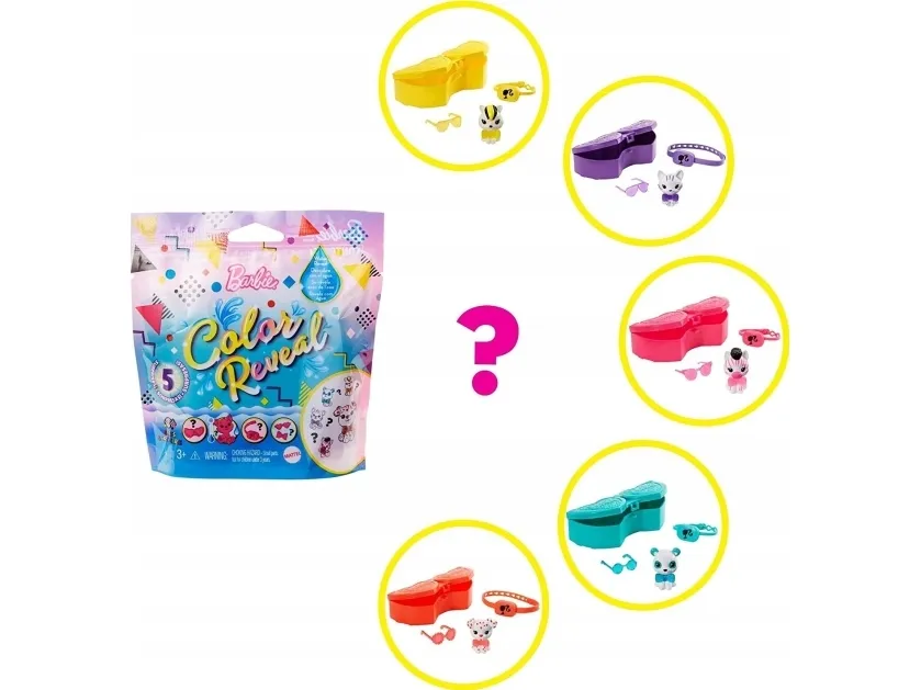 Barbie® Color Reveal™ pets deliver an unboxing experience full of surprises -- five of them! The mini case, shaped like sunglasses, holds three mystery bags hiding a Color Reveal™ pet figure and three surprise items! Dip the mystery pet covered in Color Reveal™ teal into water. The water turns a teal color, and when the pet is pulled out, its features are revealed! Find a dalmatian puppy, baby tiger, panda bear, skunk or a zebra once revealed, but the surprises continue…open the rest of the surprise bags to discover a fanny-pack and sunglasses for Barbie® and a cute little bow accessory for the pet. Each pet has a color design that matches the accessories and the case for a fun, monochromatic look. Use the pieces to play out stories or display the pet inside the sunglasses. Which will you reveal? Kids can collect them to mix and match accessories and expand the possibilities! Each sold separately, subject to availability. Colors and decorations may vary.