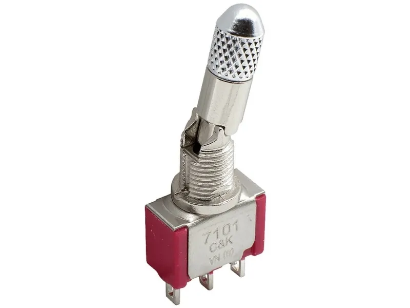 C & K COMPONENTS 7101P4D9AV2BE Toggle Switch, SPDT, On-on, Latched, 0.02A, 20VDC, 3 PCB Hole Cnt, Solder Terminal, High Flatted, Anti-rotation Actuator, Through Hole-right Angle