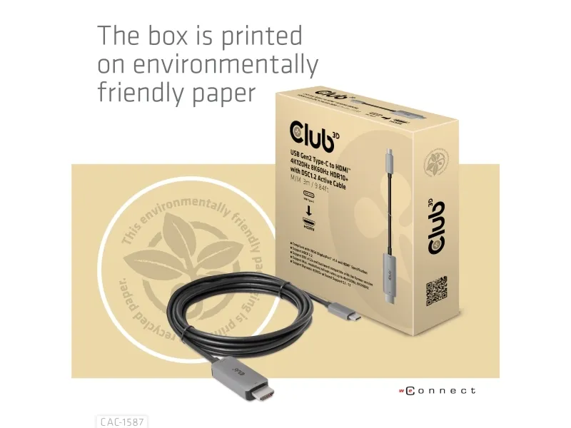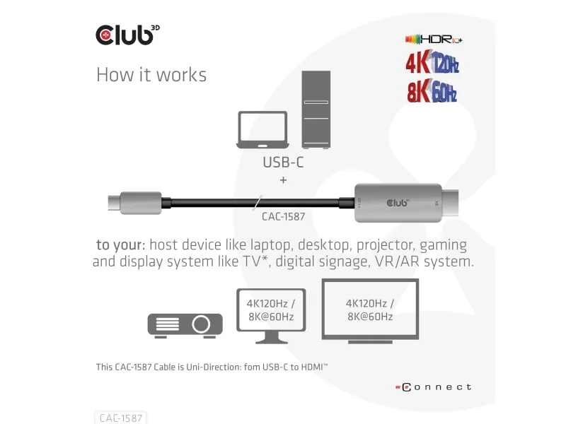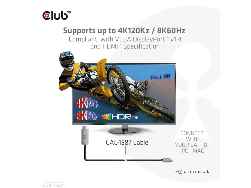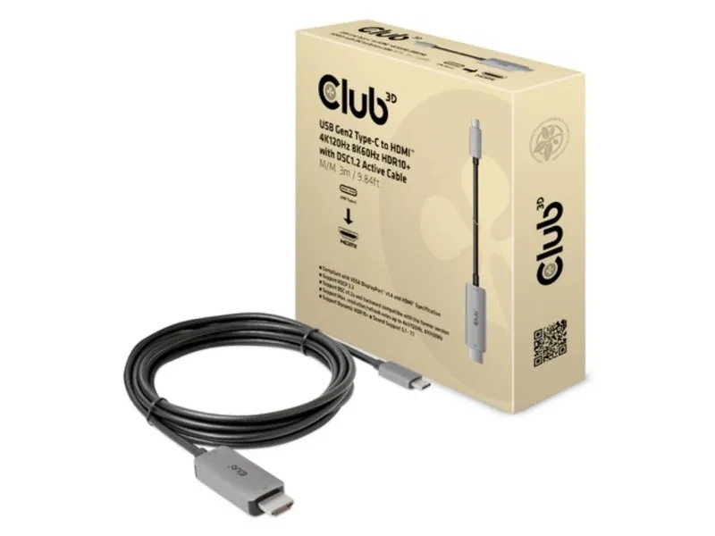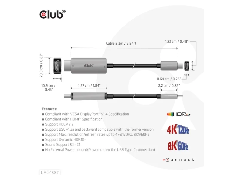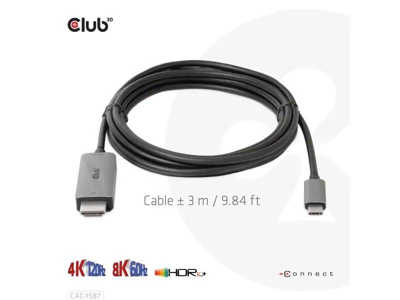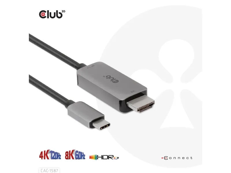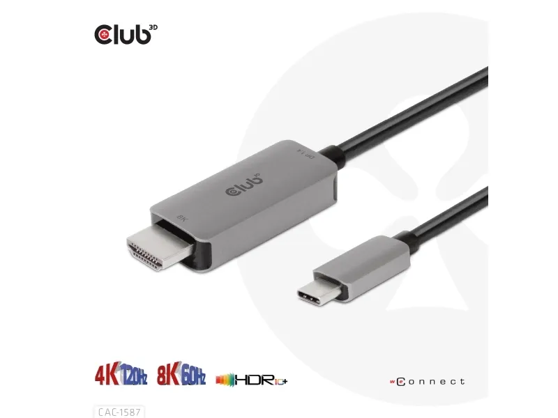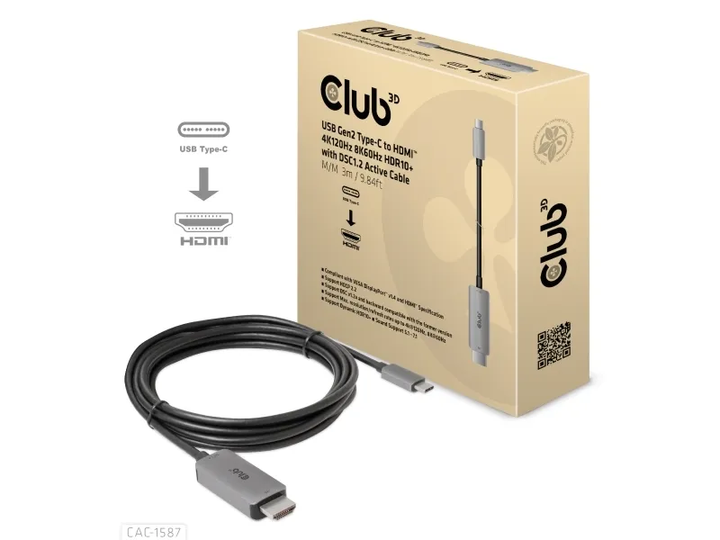 The Club 3D CAC-1587 is a video adapter cable designed for modern displays. It features USB 3.1 Gen 2 and DisplayPort 1.4 compliance, ensuring high-quality video and audio transmission. With 8K support at 60 Hz and 4K at 120 Hz, this adapter is suitable for users looking to enhance their viewing experience. Equipped with HDCP compliance and HDR 10+ support, the CAC-1587 delivers visuals for gaming and streaming.