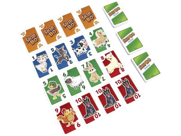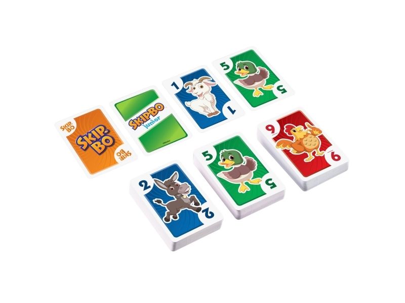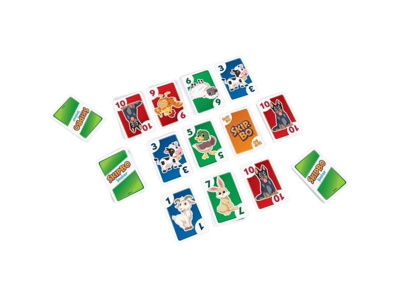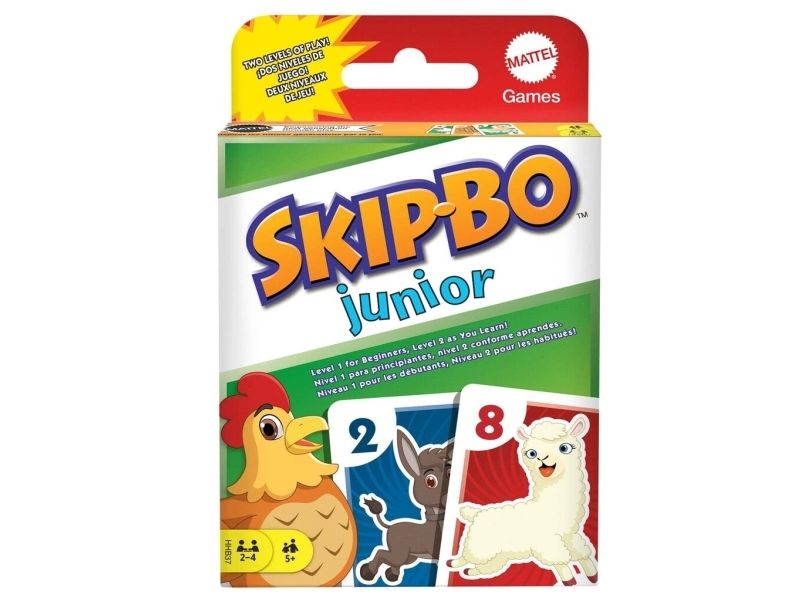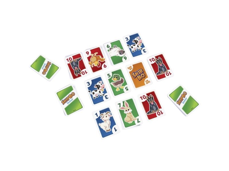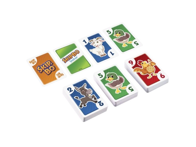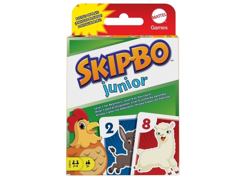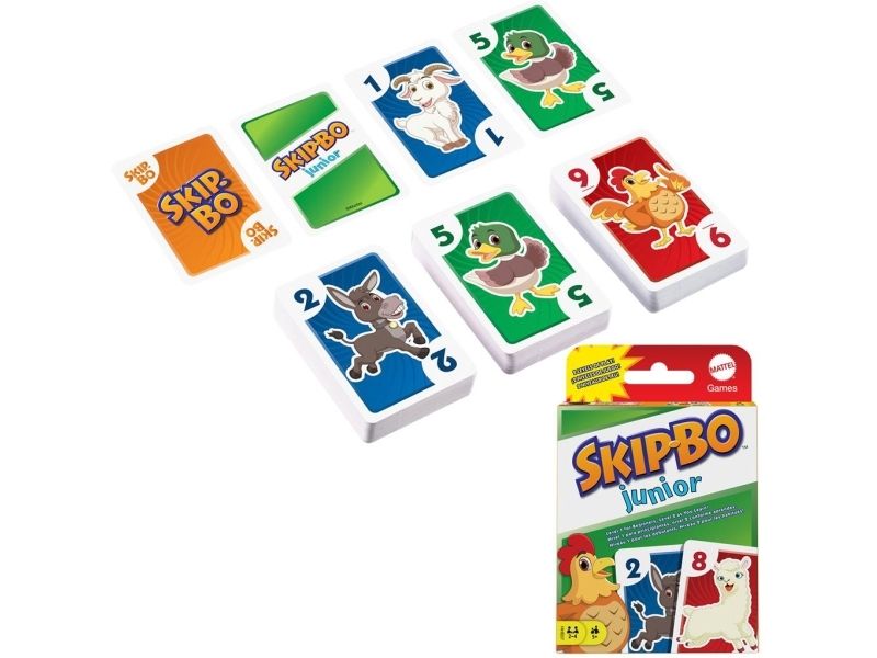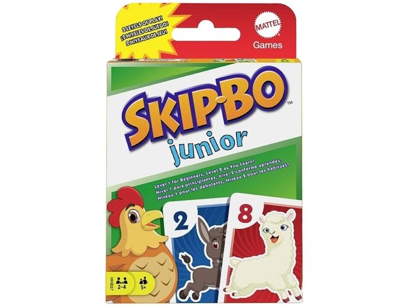 Skip-Bo Junior Card Game is the ultimate sequencing card game from the makers of UNO Card Game that features simplified game play and kid-friendly design, with bright colors and animal graphics. And with this edition, there are 2 levels! Players use skill and strategy to create sequential stacks of cards from a 1-card stack up to a 10-card stack in the center playing area, and the first player to use all the cards in their stockpile wins. The second game level adds discard piles to the mix, so kids can challenge themselves as they get better at the game. Makes a great gift for card-loving kids ages 5 years and older. Colors and decorations may vary.