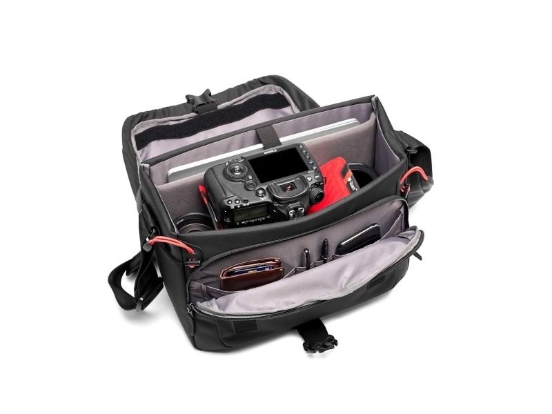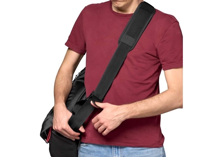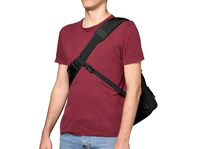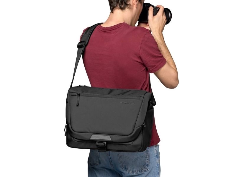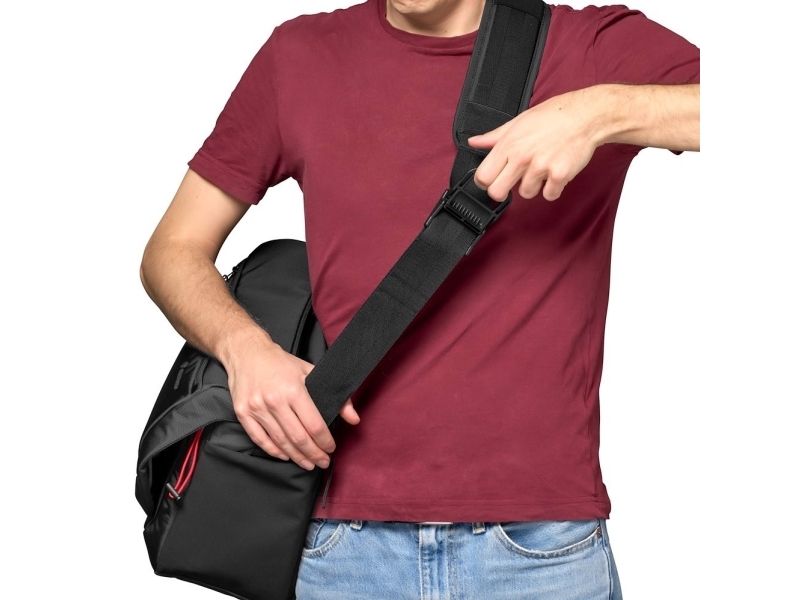 Die obere Klappe ermöglicht es dir, deine Kamera mit Leichtigkeit zu greifen, um schnell zu drehen. Der Messenger lässt sich sowohl mit Klettverschluss als auch mit Schnallen öffnen. Weitere Designmerkmale dieser Kamera-Messenger-Tasche sind ein gepolstertes Fach für Ihren 14 Zoll Laptop und ein verstellbarer Schultergurt für Komfort und Bequemlichkeit. Sie ist außerdem mit einem Stabilisierungsgurt ausgestattet, der die Bewegung zu Fuß oder auf dem Fahrrad reduziert und so dafür sorgt, dass die Ausrüstung ohne Risiko an ihrem Platz bleibt. Der Schultergurt verfügt außerdem über eine Schnalle zur schnellen Längenverstellung, mit der du den Gurt schnell verlängern und die Tasche schnell über den Körper schwingen kannst, um deinen nächsten Schritt zu machen. Außerdem verfügt sie über eine große Vordertasche mit mehreren Fächern, in der du all dein Zubehör verstauen kannst.