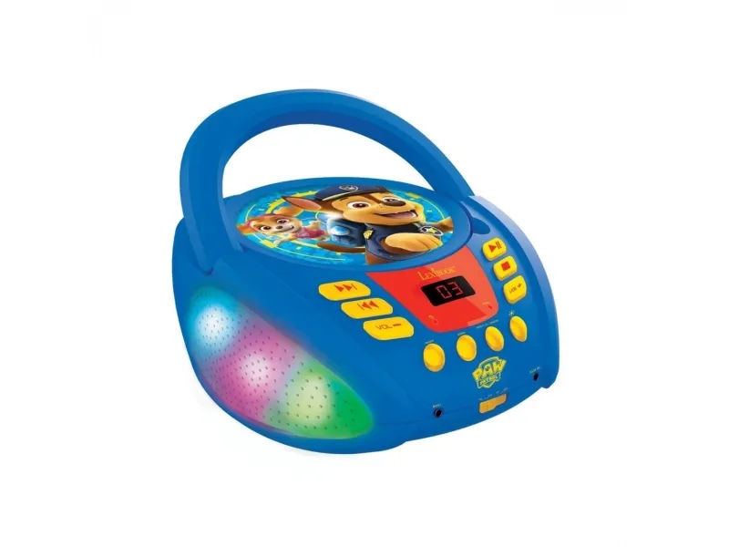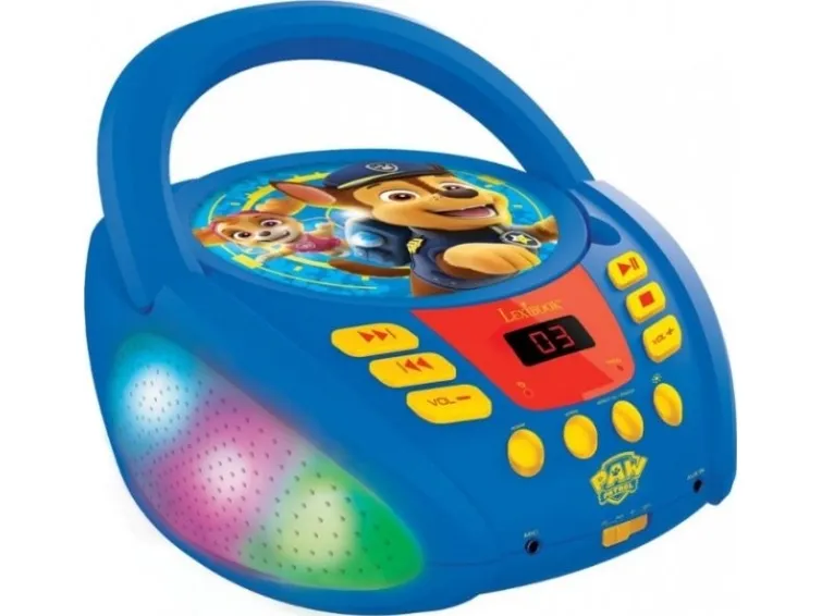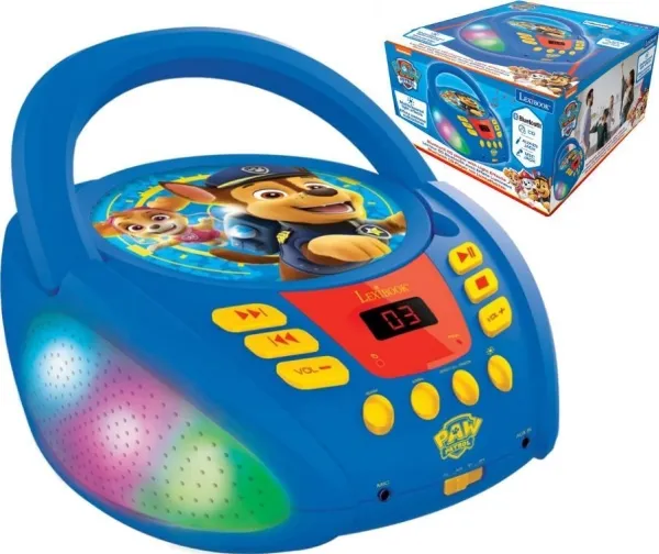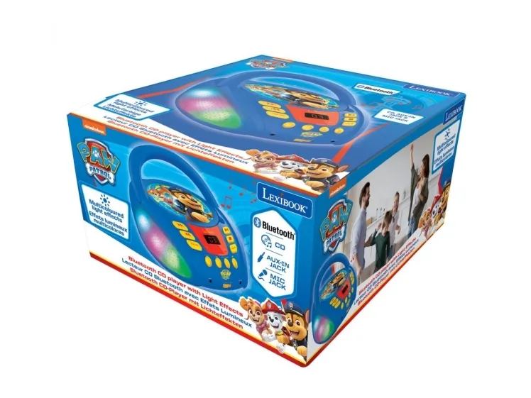 The perfect transportable Paw Patrol CD player (CD / CD-R / CD-RW) for kids with multicolor light effects! Bluetooth 5.0, connects wirelessly with your smartphones, tablets, and other Bluetooth devices! Microphone jack to make it a karaoke and sing with the heroes of the Paw Patrol, Chase and Skye!