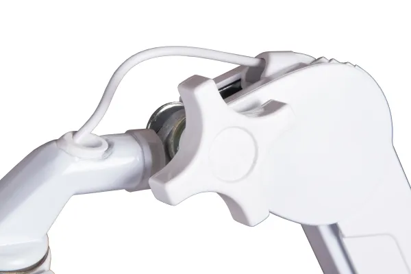 The lens in a durable frame is protected with a hinged dust cover. It protects the optics from dust when a magnifier is put away for storage. The light is placed next to the lens. The lamp is powerful enough to enable you to work even in a dark room. It is powered by an AC supply.