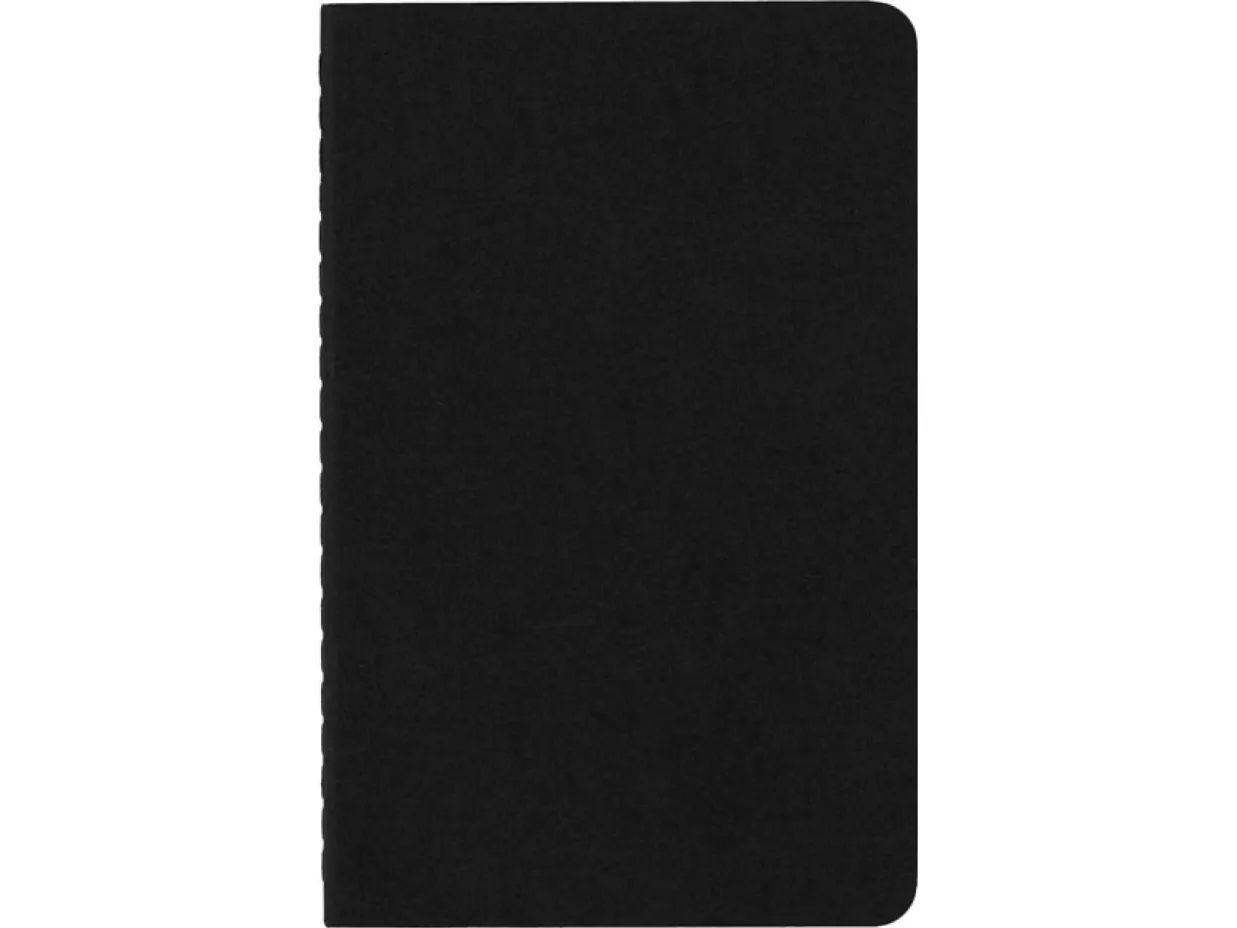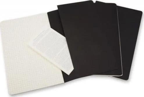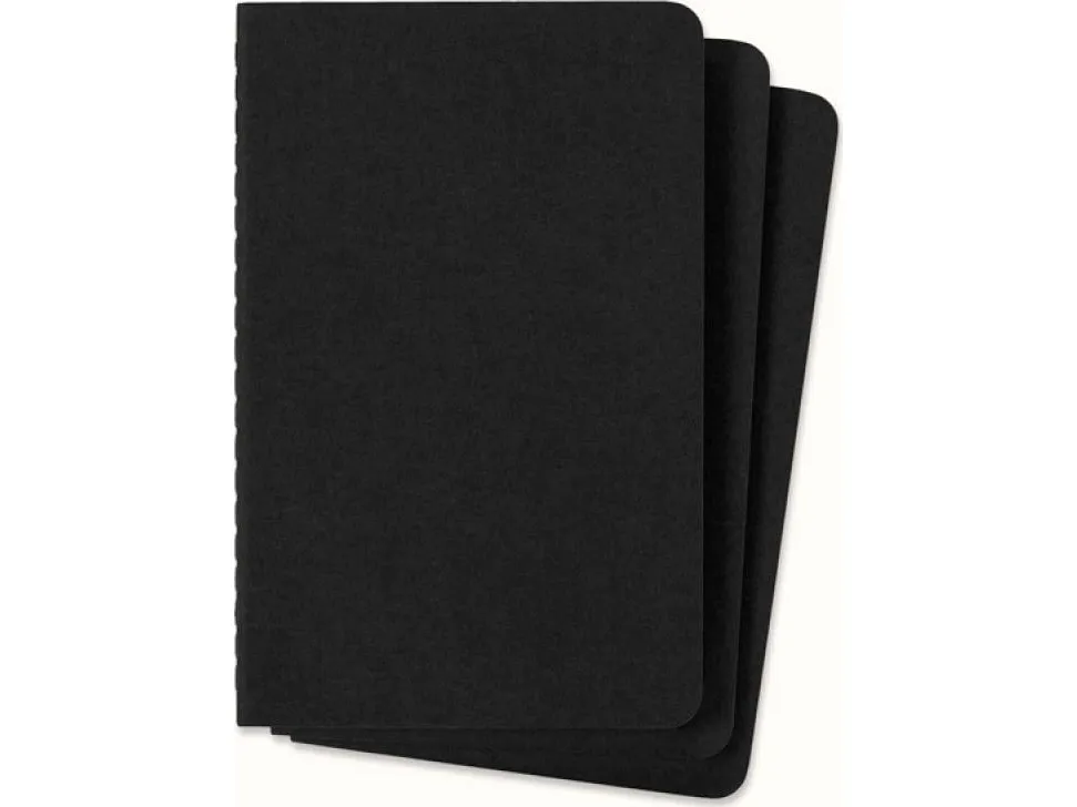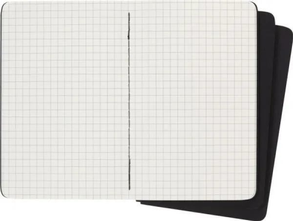 Die Notizhefte haben einen stabilen Einband aus schwarzem Karton mit sichtbarer Fadenheftung. Die letzten 16 Seiten sind heraustrennbar, mit einer grossen Innentasche für lose Zettel und einem Text zur Geschichte von Moleskine. Kariertes, chlorfrei gebleichtes Papier. 3er-Set