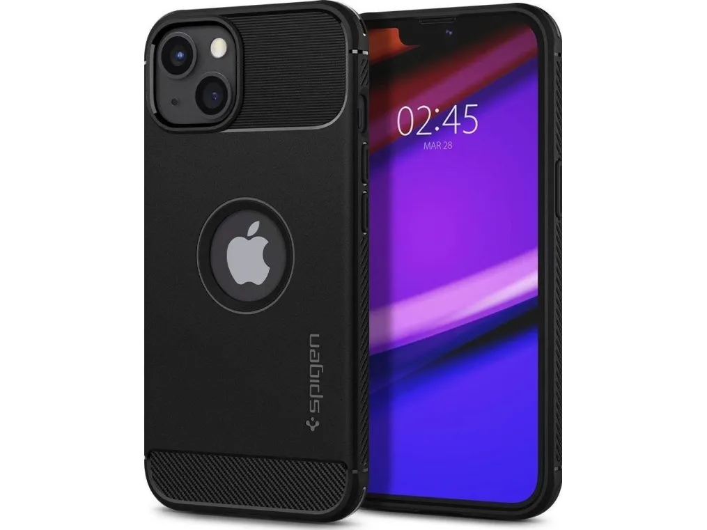 Inspired by car design, Rugged Armor® secures the iPhone 13 in a timeless and streamlined body. Its slim frame is textured with carbon fiber detailing and subtle glossy accents.Spigen ACS03518. Case type: Cover, Brand compatibility: Apple, Compatibility: iPhone 13, Maximum screen size: 15.5 cm (6.1"), Product colour: Black