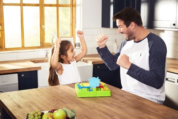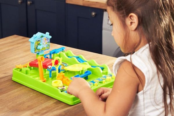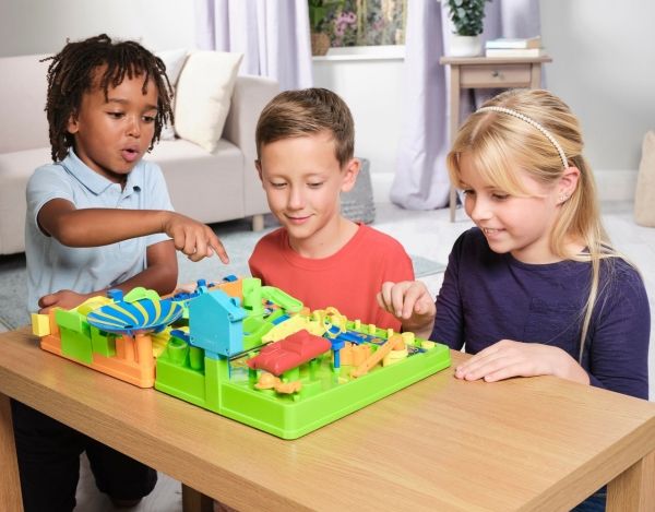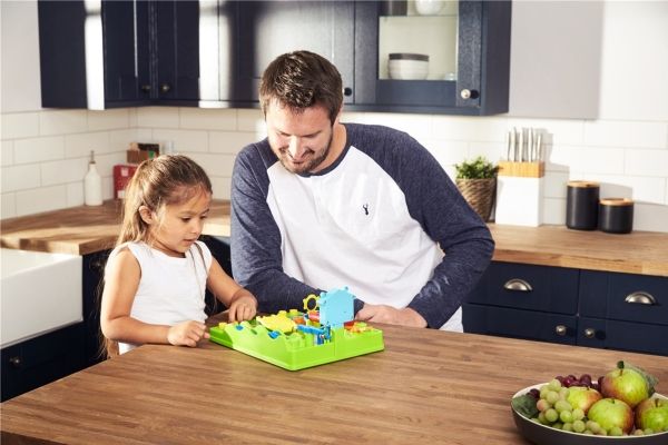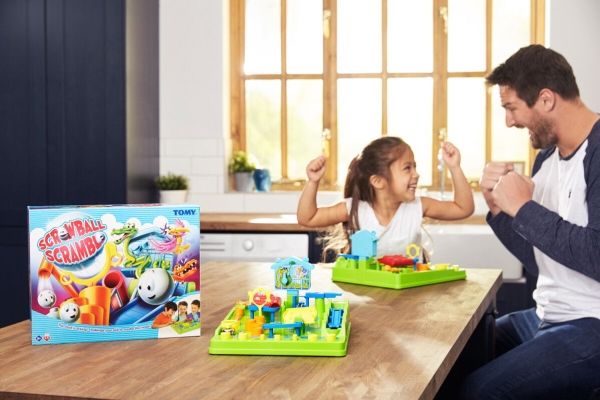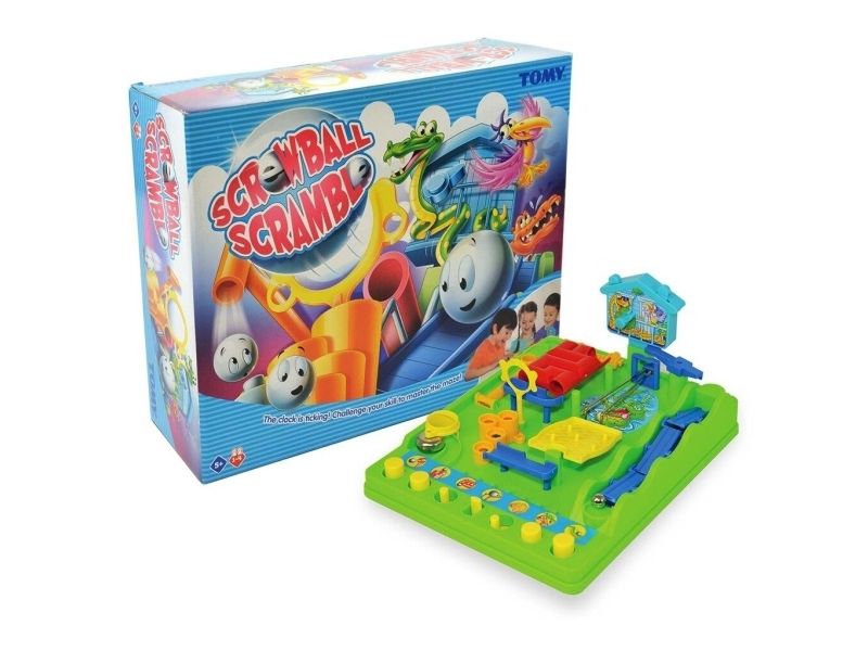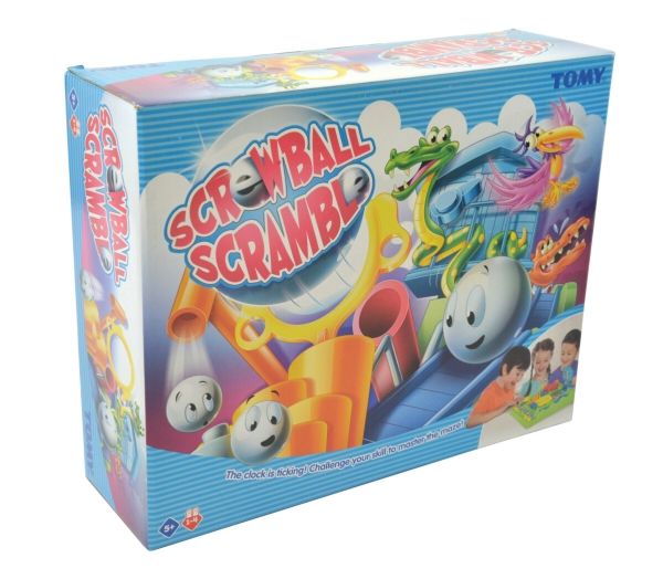 Al den sjove og nervepirrende energi fra The Screwball Scramble Game - den klassiske all-action-udfordring fra TOMY Games - er pakket i ét sæt kort. Start ud med de 12 kort, der udgør standardspillet, og byg din egen forhindringsbane med startkortet i den ene ende og afslutningskortet i den anden. Læg banen ud, så den danner et 4 x 3 kortgitter, som udgør standardspillet. Når det er din tur, skal du kaste terningerne - du skal matche den kombination, der er vist på kortet for at flytte et felt frem til det næste kort og det næste. For eksempel kan det være nødvendigt at få en 2'er eller højere, eller at kaste to forskellige tal i tre kast. Hvis du ikke kan, så er det bare ærgerligt, og det er din modstanders tur. Den, der når først i mål, vinder. Når du føler dig klar, kan du bruge hele bunken, hvor færdighedskort kan tilføje eller trække et eller to point til dit kast – eller overrasker din modstander ved at ændre deres. Med 1-ON-1 skal to spillere kæmpe på en freestyle-bane, og