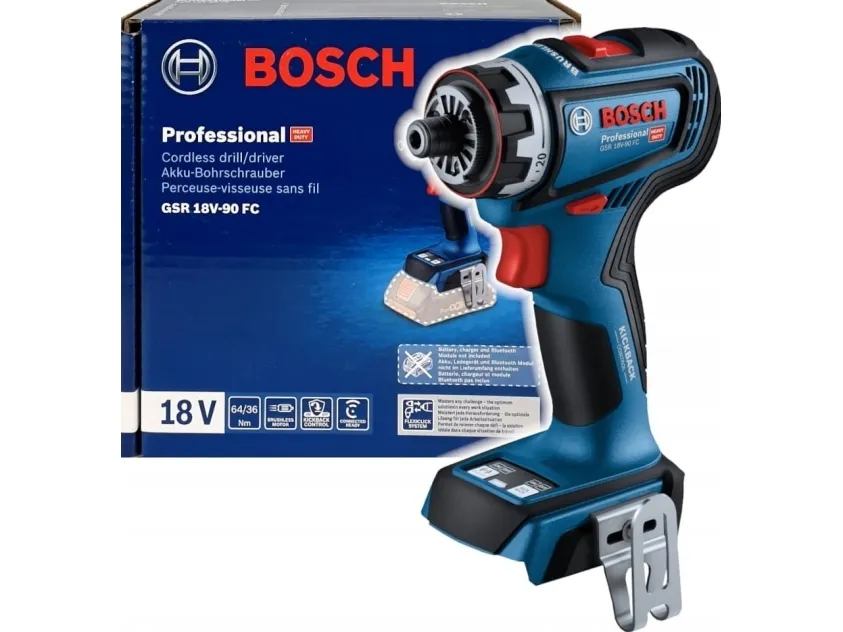 Bosch GSR 18V-90 FC PROFESSIONAL. Product design: Pistol grip drill, Chuck type: SDS Plus, Motor type: Brushless. Chuck capacity (max): 1.3 cm, Idle speed (max): 2100 RPM, Drilling diameter in concrete (max): 1 cm. Power source: Battery, Battery voltage: 18 V. Weight: 920 g, Width: 77 mm, Depth: 136 mm