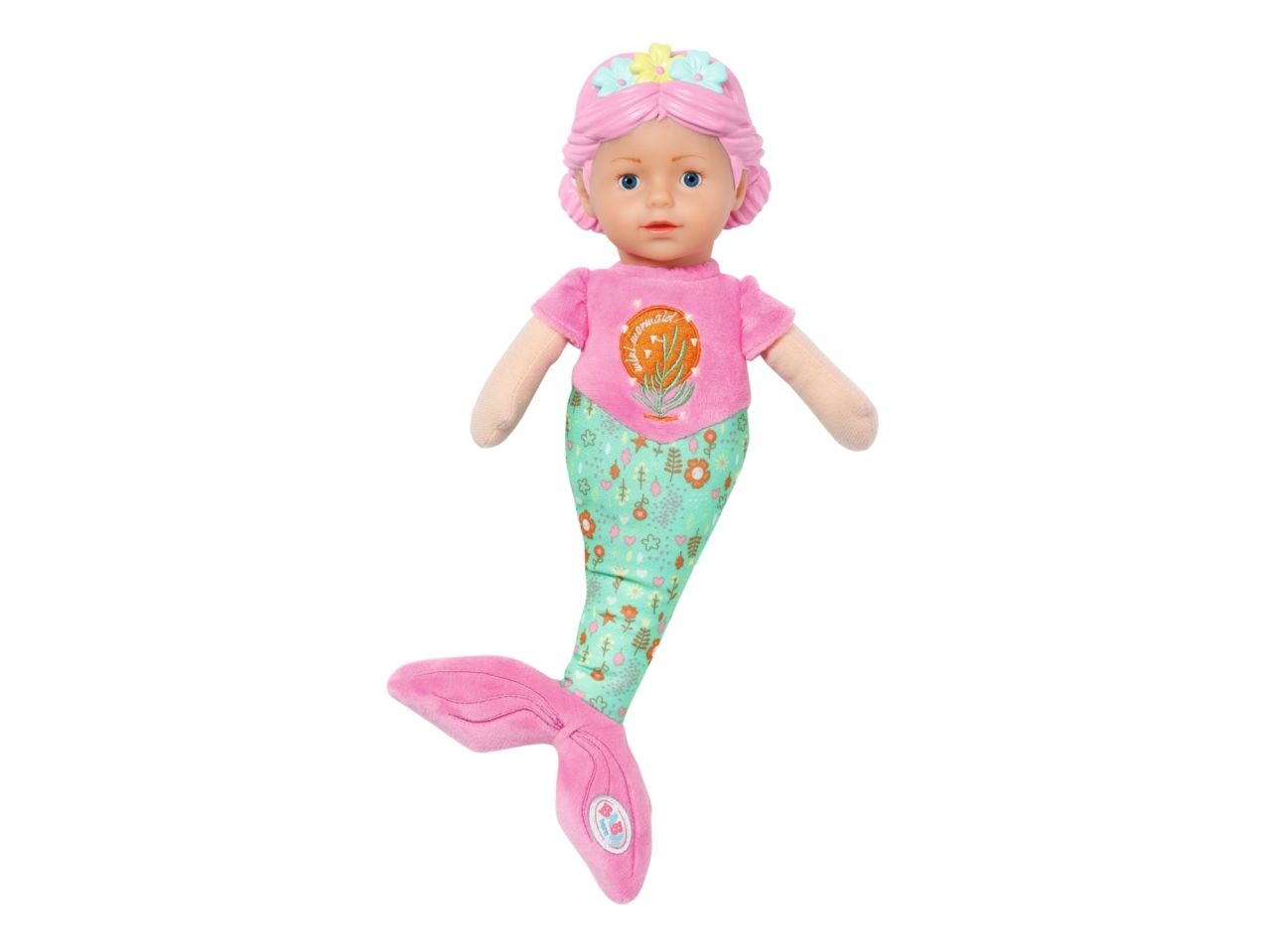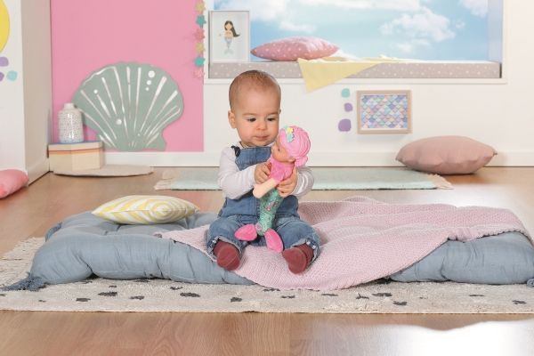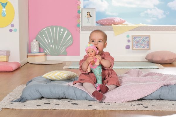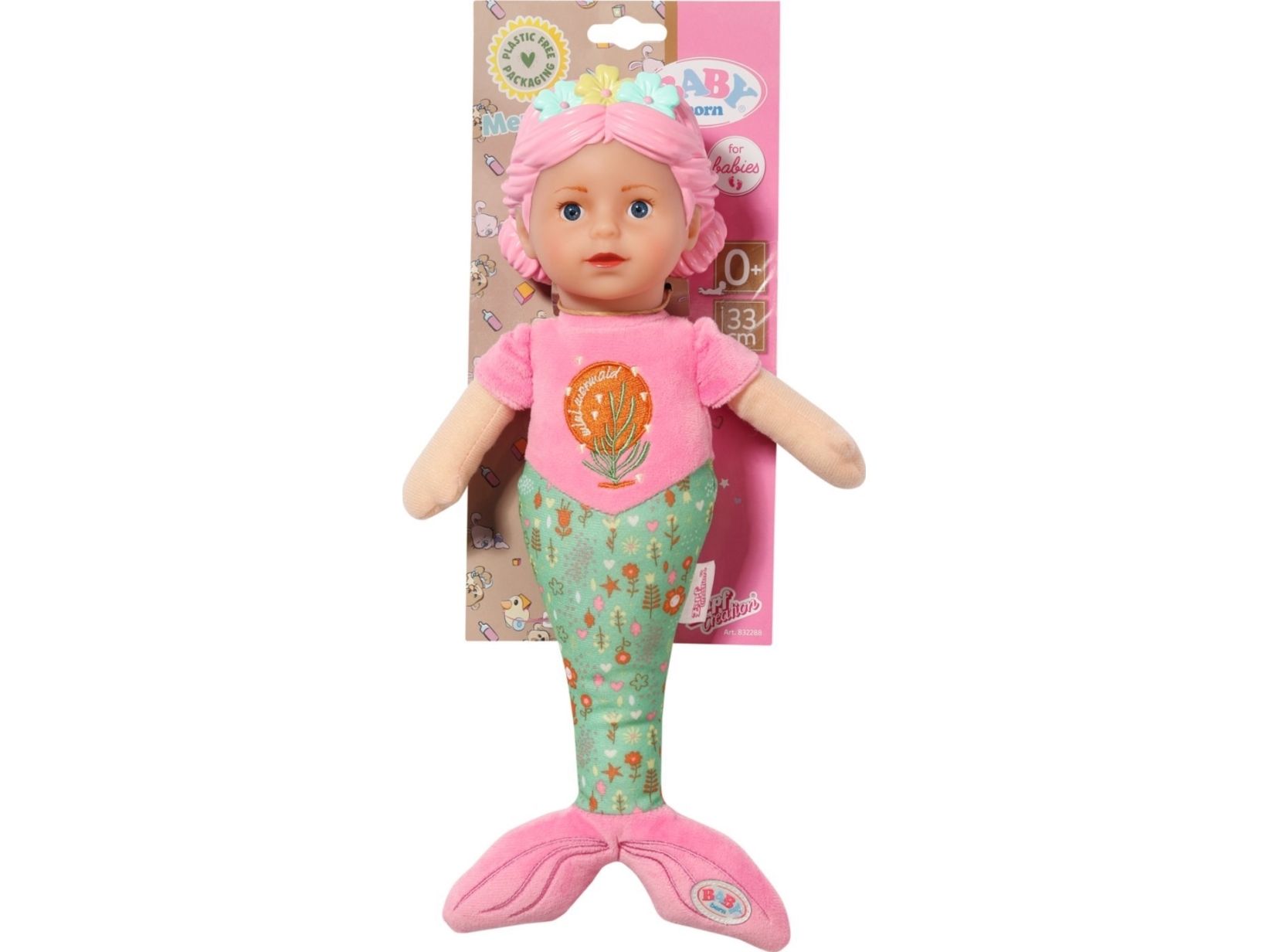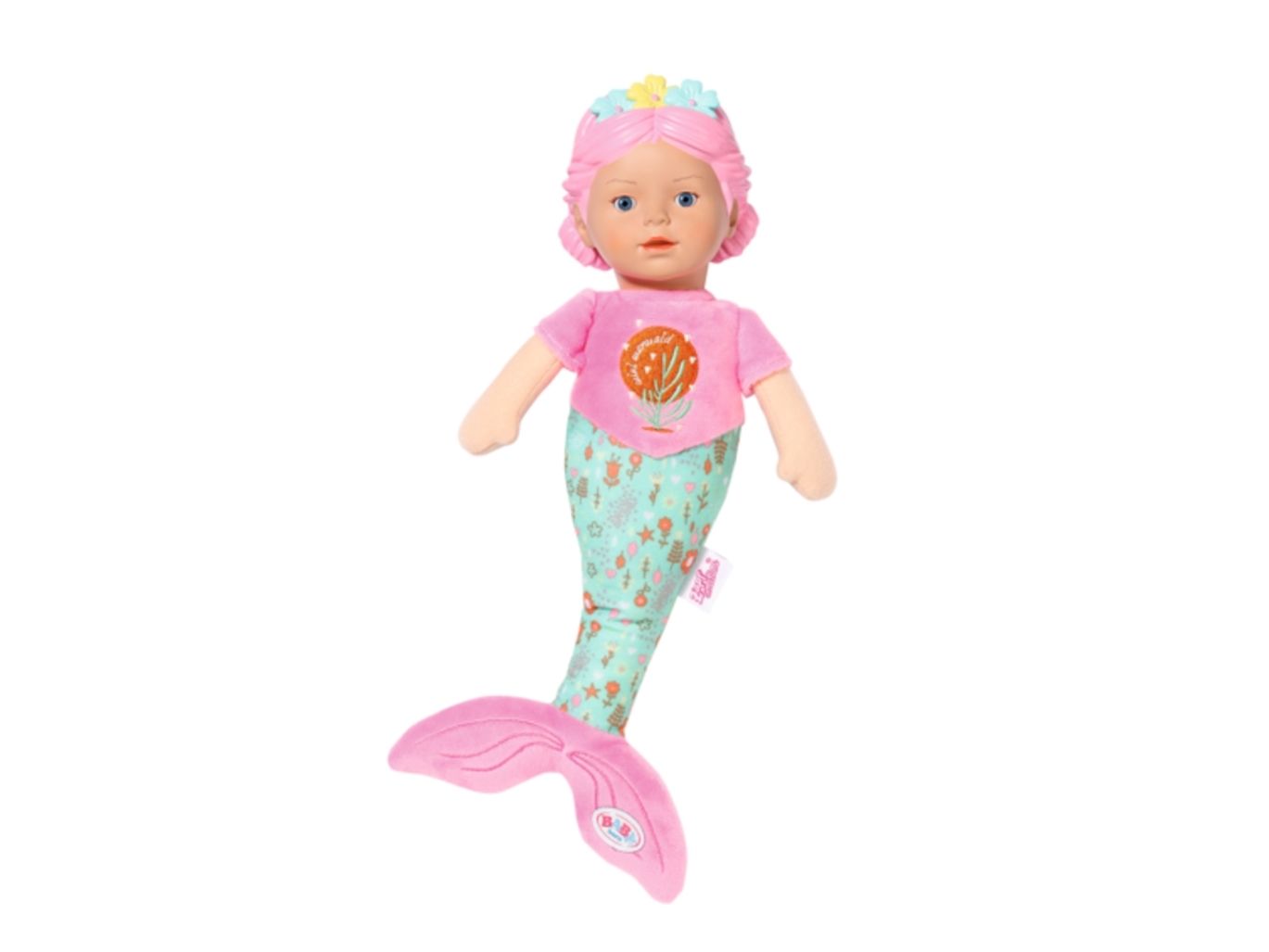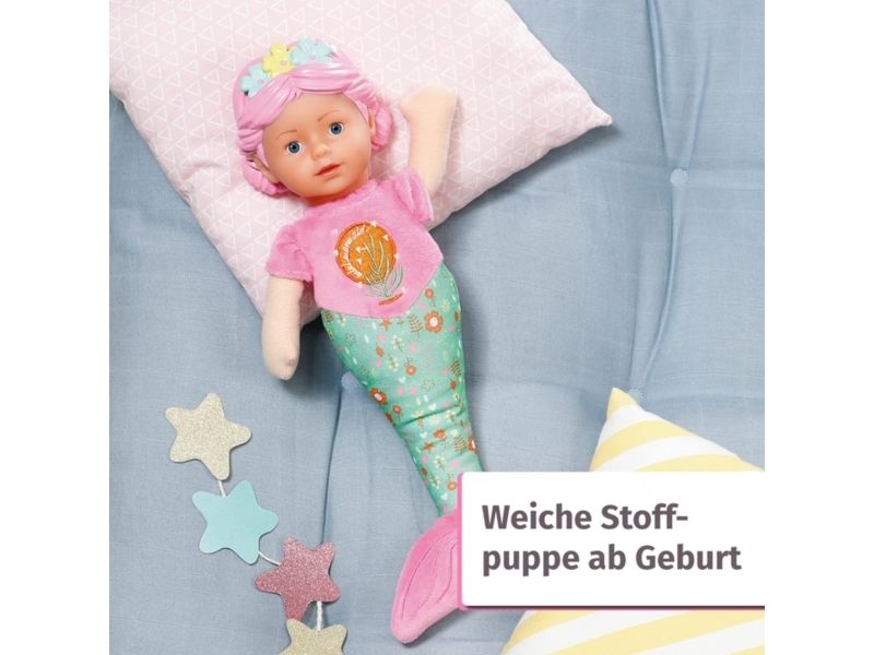 ''Wer steigt denn da fröhlich aus dem Kissen-Meer empor? Die kuschelige Meerjungfrau hat einen weichen Stoffkörper. Das Oberteil mit Algenstickerei und die rosa Flossen sind aus dem gleichen plüschigen Stoff. Der türkise Schwanz ist mit natürlichen Drucken versehen. Ihr softer Kopf aus Vinyl ist mit pinken Haaren verziert. Die Zöpfe erinnern an Seeigel. Einige blühende Wasserpflanzen haben sich als Blumenkranz in der Frisur verfangen. Und falls die Meerjungfrau mal einen Tauchgang in der Abendmilch gemacht hat, kann sie problemlos bei 30°C gewaschen werden. •