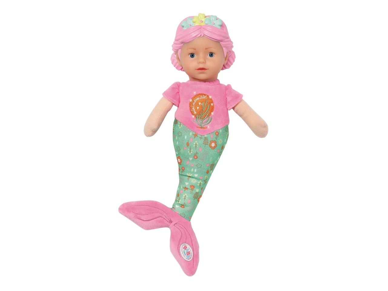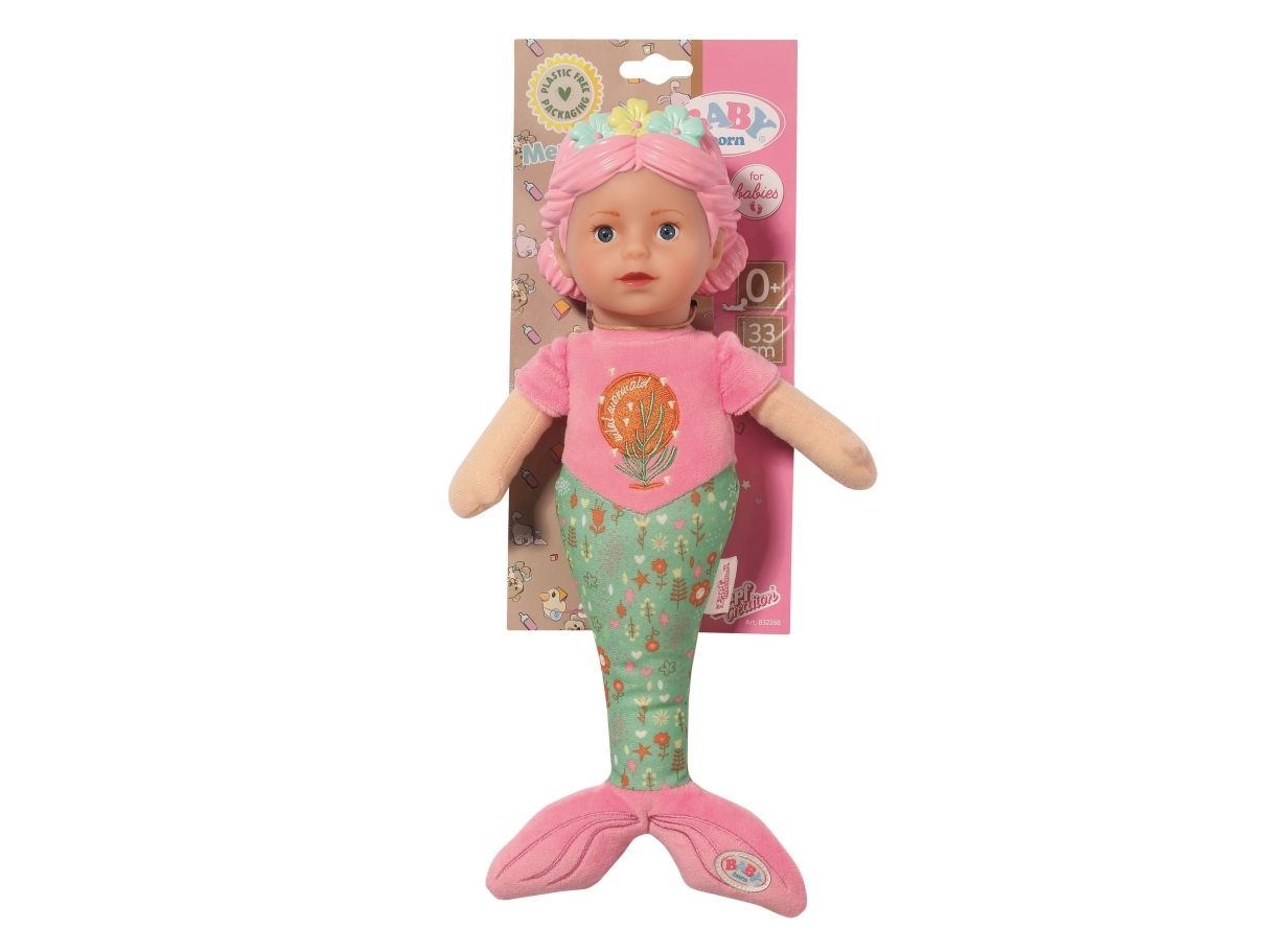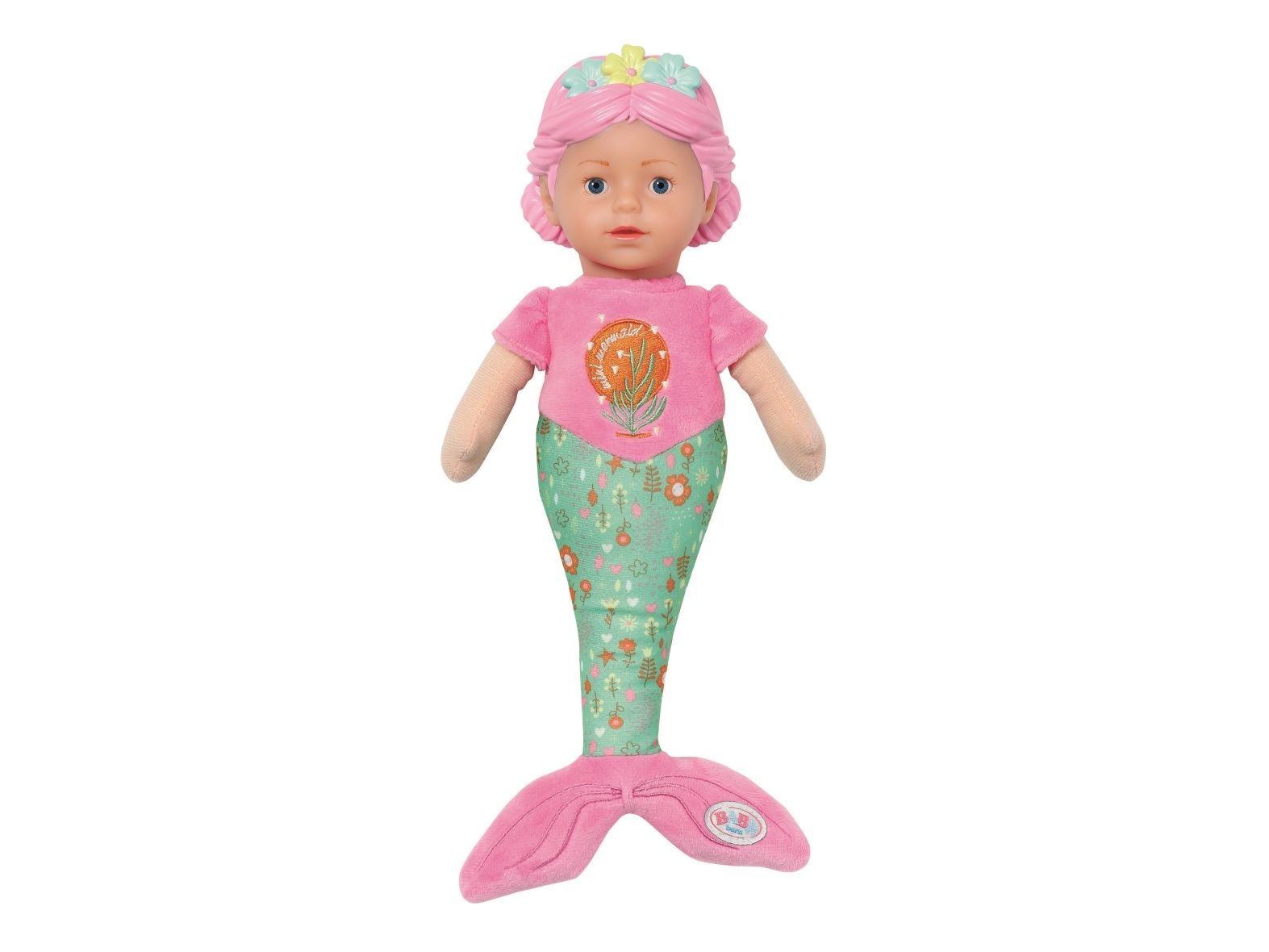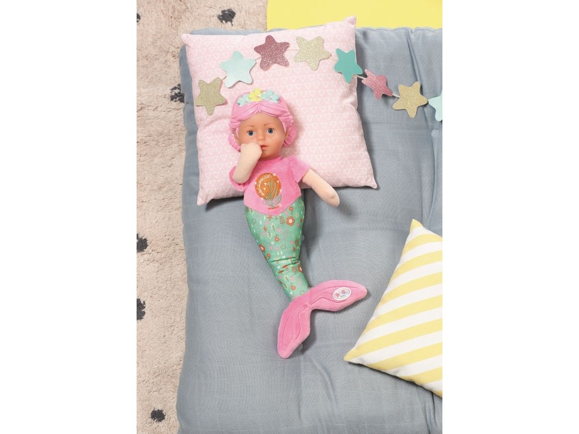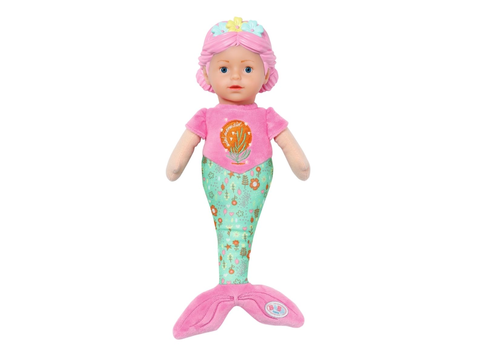 ''Wer steigt denn da fröhlich aus dem Kissen-Meer empor? Die kuschelige Meerjungfrau hat einen weichen Stoffkörper. Das Oberteil mit Algenstickerei und die rosa Flossen sind aus dem gleichen plüschigen Stoff. Der türkise Schwanz ist mit natürlichen Drucken versehen. Ihr softer Kopf aus Vinyl ist mit pinken Haaren verziert. Die Zöpfe erinnern an Seeigel. Einige blühende Wasserpflanzen haben sich als Blumenkranz in der Frisur verfangen. Und falls die Meerjungfrau mal einen Tauchgang in der Abendmilch gemacht hat, kann sie problemlos bei 30°C gewaschen werden. •