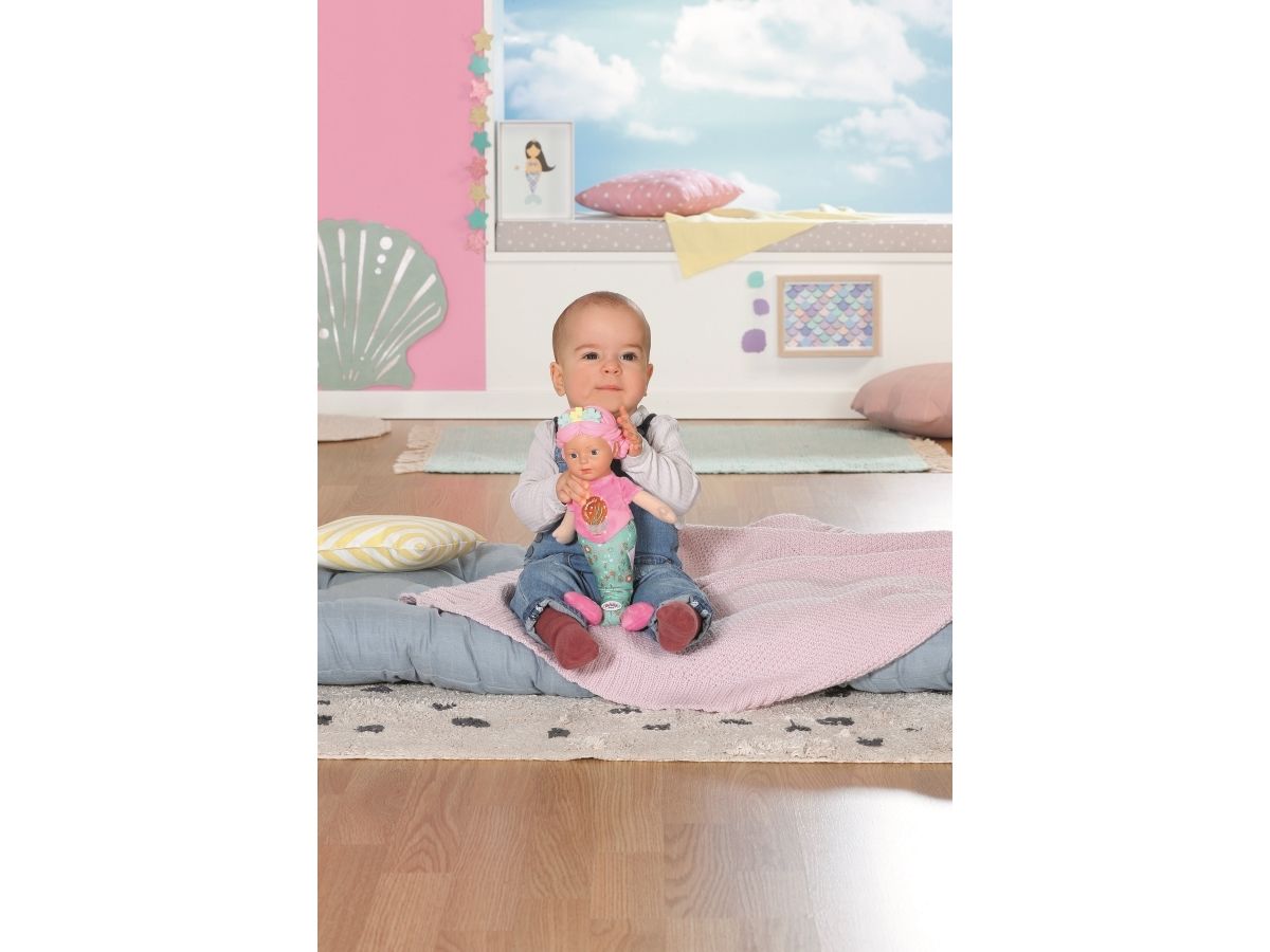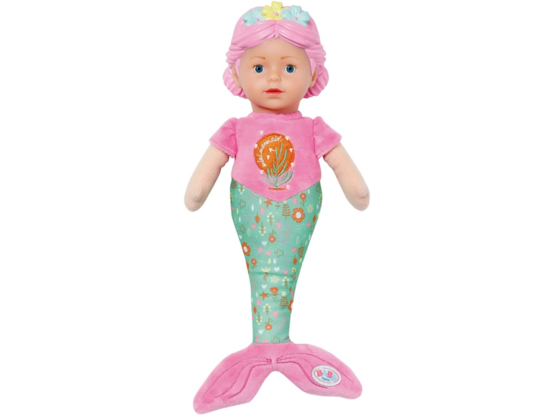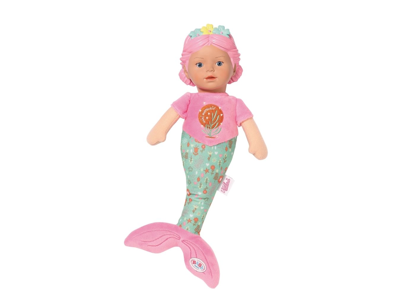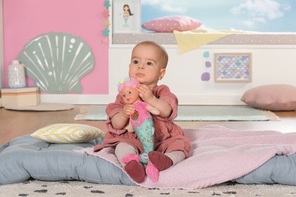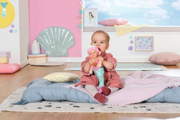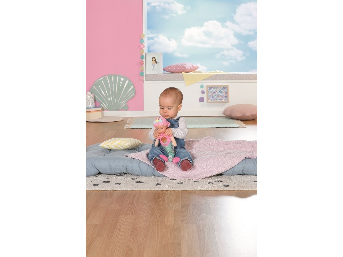 ''Wer steigt denn da fröhlich aus dem Kissen-Meer empor? Die kuschelige Meerjungfrau hat einen weichen Stoffkörper. Das Oberteil mit Algenstickerei und die rosa Flossen sind aus dem gleichen plüschigen Stoff. Der türkise Schwanz ist mit natürlichen Drucken versehen. Ihr softer Kopf aus Vinyl ist mit pinken Haaren verziert. Die Zöpfe erinnern an Seeigel. Einige blühende Wasserpflanzen haben sich als Blumenkranz in der Frisur verfangen. Und falls die Meerjungfrau mal einen Tauchgang in der Abendmilch gemacht hat, kann sie problemlos bei 30°C gewaschen werden. •