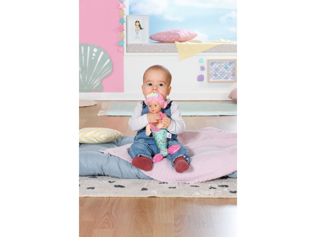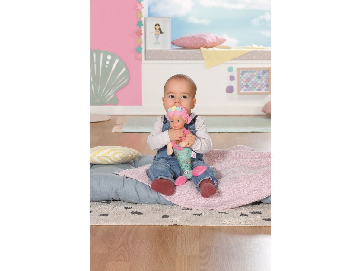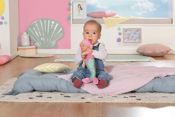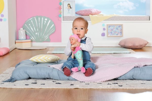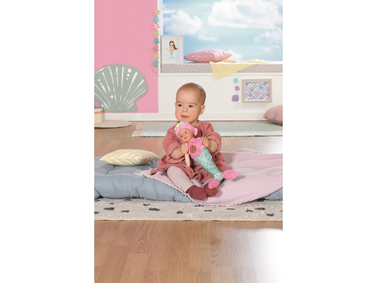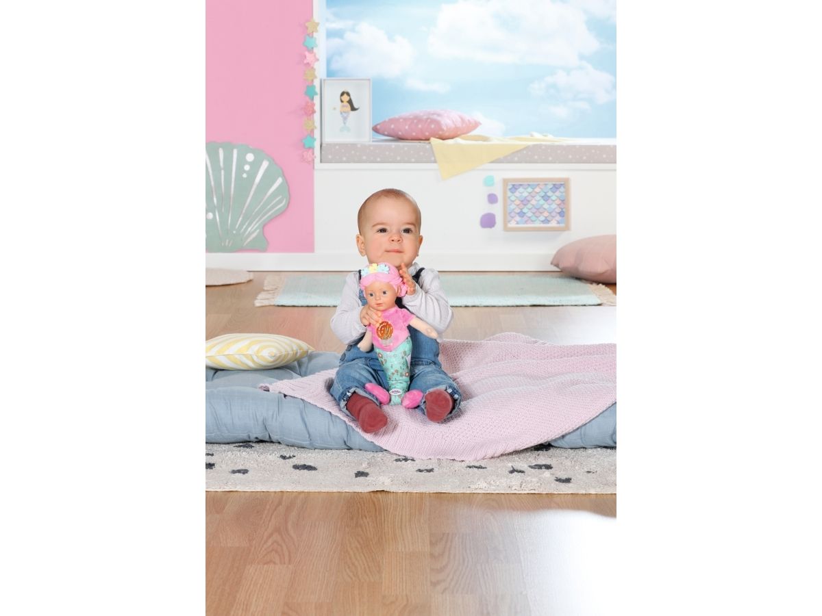''Wer steigt denn da fröhlich aus dem Kissen-Meer empor? Die kuschelige Meerjungfrau hat einen weichen Stoffkörper. Das Oberteil mit Algenstickerei und die rosa Flossen sind aus dem gleichen plüschigen Stoff. Der türkise Schwanz ist mit natürlichen Drucken versehen. Ihr softer Kopf aus Vinyl ist mit pinken Haaren verziert. Die Zöpfe erinnern an Seeigel. Einige blühende Wasserpflanzen haben sich als Blumenkranz in der Frisur verfangen. Und falls die Meerjungfrau mal einen Tauchgang in der Abendmilch gemacht hat, kann sie problemlos bei 30°C gewaschen werden. •