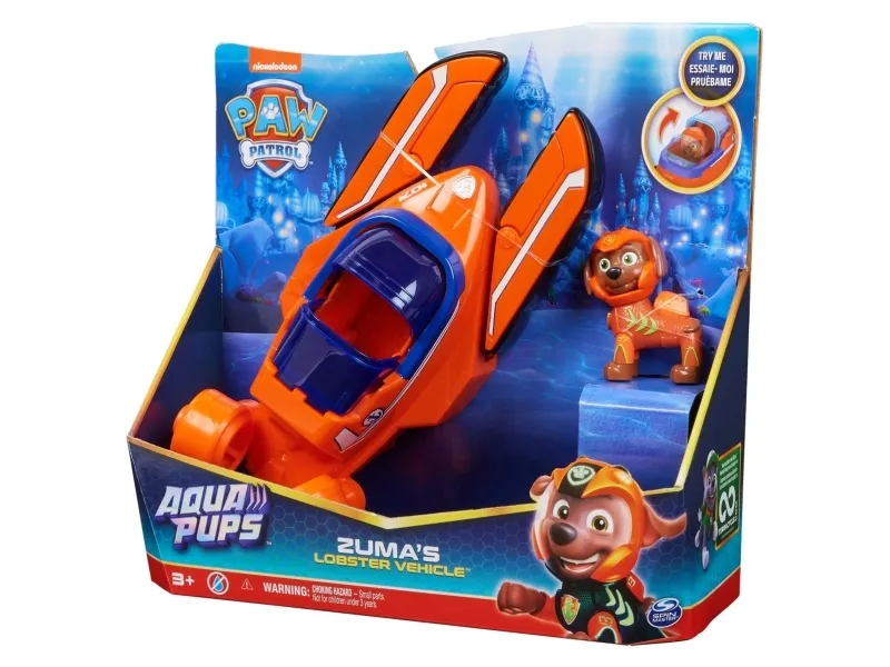 Team up with Zuma, for some action packed rescue missions, in his Aqua Pups – Lobster Rescue Vehicle! Suited in his orange Aqua Pups wetsuit and helmet, Zuma is ready for supercharged rescues in the pretend sea! Zuma’s Lobster Vehicle features an exciting transformation! Simply place Zuma in the vehicle cockpit and slide the canopy shut, to engage the lobster claw action, transforming his vehicle into rescue mode! When there’s trouble, quickly transform into rescue mode and speed off to the rescue, then use the articulated lobster claws to clear away any obstacles! Create PAWsome adventures with Zuma’s Lobster Rescue Vehicle! Then, for even more exciting series-inspired missions, collect all the Aqua Pups figures and toy vehicles, (sold separately) for endless hours of action-packed adventures! With PAW Patrol toys, kids can explore their imaginations and develop their motor skills, through pretend play, as they bring their favorite scenes from the show to life! PAW Patrol action figures, toy cars, playsets and stuffed animals are the perfect toys for boys and girls aged 3 and up, so bring home the excitement of the PAW Patrol: Aqua Pups!