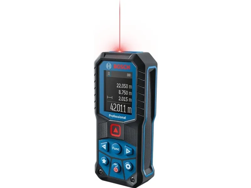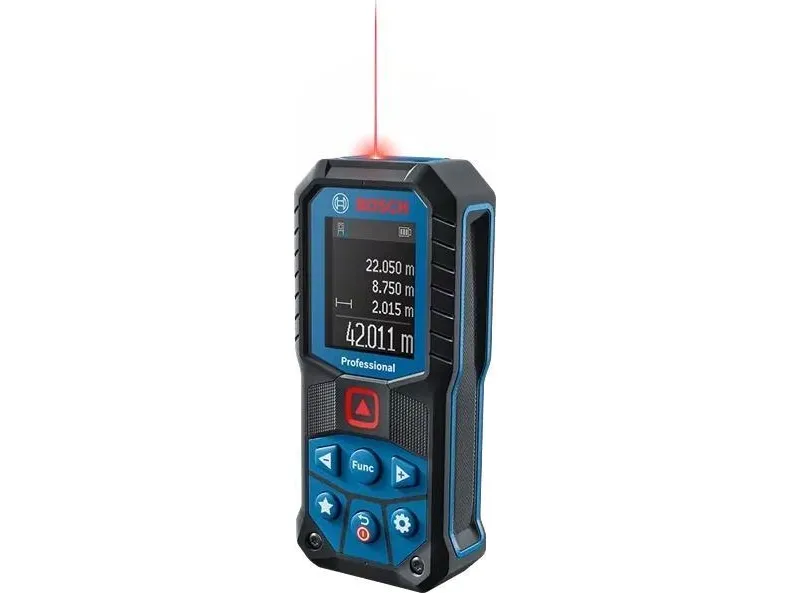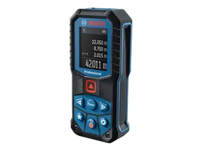 The GLM 50-22 Professional withstands rough conditions on construction sites. Its IP65 design provides complete protection from dust particles and jets of water, while its shock-absorbing housing brings 1.5-m drop resistance even on hard concrete. With a customizable button, favorite measurement functions or settings can be defined. Its intuitive user interface supports 30 languages and consists of a color display and Big Numbers mode for better readability. For self-explaining usage it features a new help function that shows all measurement options.