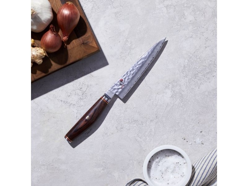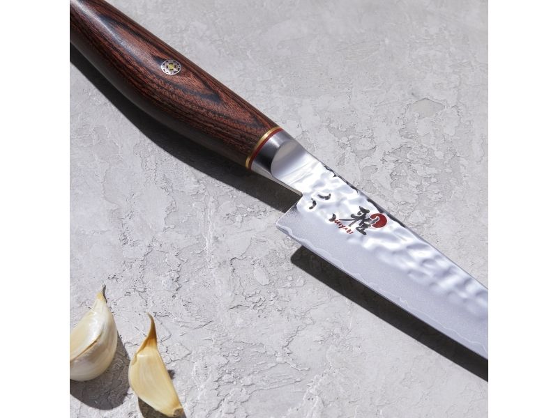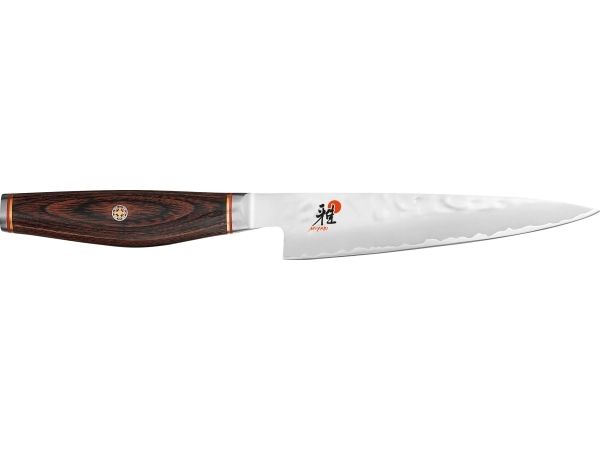 The SHOTOH from Miyabi is designed for the slicing, cutting and peeling of fruit and vegetables. Preparing cold platters or delicious curries containing lots of vegetables are easy with this knife. The double-edged blade and Honbazuke honing give the knife its sharpness. The authentic Japanese blade profile ensures the 13 cm long SHOTOH is easy to use and will stay sharp. The knife is part of the MIYABI 6000MCT series and has a blade with a hammered finish and a Tsuchime look. The handle is made of premium, smooth-grained cocobolo pakka wood. A mosaic pin gives it a special design feature. The handle will retain its shape and has easy care properties. The knife is finely balanced to make cutting an effortless and pleasurable task. The blade is manufactured from Micro Carbide powder steel embedded between two additional steel layers. The central section achieves a hardness rating of around 63 Rockwell. The knife also undergoes special hardening procedures such as ice hardening at -196 degrees Celsius. This increases the blade's stability, flexibility, durability and robustness to provide you with a practical and sharp knife to effortlessly carry out a multitude of kitchen tasks.