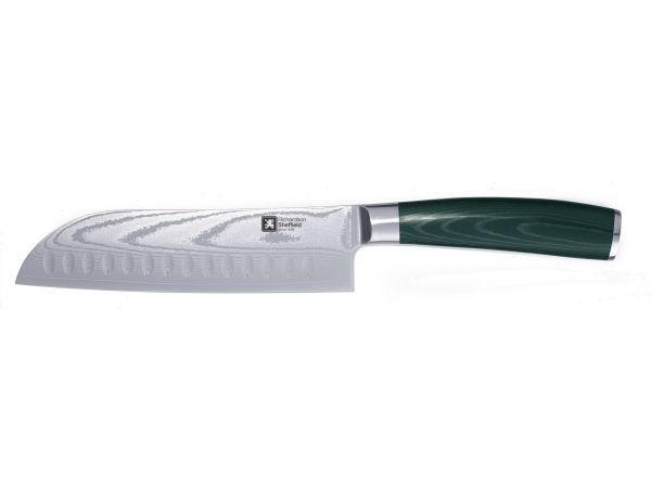 Klinge: Die Klinge des Midori Schälmessers von Richardson Sheffield ist handgeschmiedet und besteht aus 67 Lagen Damaststahl. Dies gewährleistet eine außergewöhnliche Härte und Schärfe der Klinge und ein schönes Erscheinungsbild der Klinge, auf dem Sie die Schichten sehen können. Durch die komplette Handarbeit ist die Schnittfläche hauchdünn lackiert. All dies kommt der Benutzerfreundlichkeit voll und ganz zugute und Sie fühlen sich wie ein japanischer Koch.