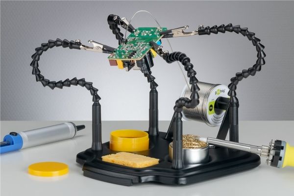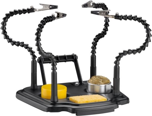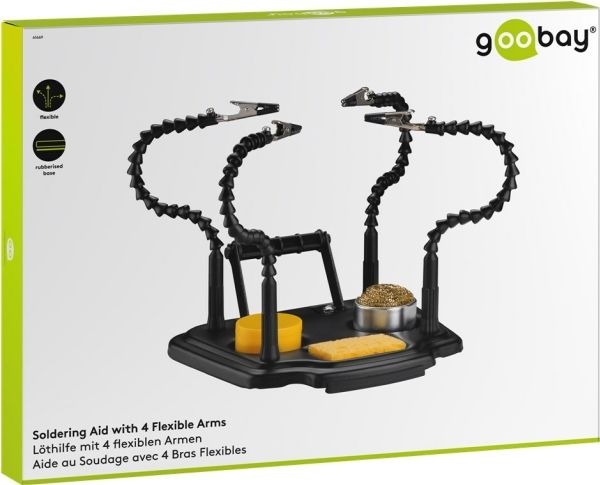 helfende Hand für alle filigranen Löt- und Bastelarbeiten Löthilfe mit 4 flexiblen Schwanenhals-Armen und Krokodilklemmen ist die zuverlässige dritte Hand beim Löten, Lackieren und Basteln Idealer Halter für Präzisionsarbeiten an Elektronikteilen wie Platinen, im Modellbau, Kunsthandwerk und in der Schmuckreparatur Perfekte Ergänzung zur Lötstation, ausgestattet mit integriertem Lötzinnhalter, 1x Lötschwamm, Reinigungswolle und Flussmittel (Lötharz) Lötspitzenreiniger aus Messing entfernt effektiv Rückstände auf Lötspitzen und verhindert durch die Trockenreinigung Rostansätze an der Spitze Reinigungsschwamm entfernt überschüssigen Lötzinn und Ablagerungen, die sich während der Arbeit ansammeln (Lieferung in trockenem Zustand, quillt beim Kontakt mit Wasser auf) Isolierte Krokodilklemmen sorgen für erhöhte Sicherheit bei Elektronikarbeiten und schützen das Werkstück vor Beschädigungen Robuster, schwerer Metallfuß (ca. 190 x 170 mm) mit Gummierung gegen Verrutschen sorgt für sicheren Stand während der Arbeit